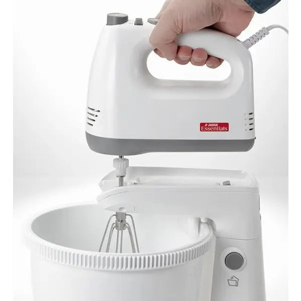 The Judge Essentials Stand Mixer is designed for versatility and ease. Its 2-in-1 feature lets you detach the mixer for handheld use, while five speed settings help you handle any mixing or whisking task with ease. The thumb-operated speed control makes it simple to adjust, and the auto-rotating bowl combined with a tilting head ensures thorough mixing every time. Removable whisks and bowl make cleaning straightforward, making this mixer a reliable companion for cakes, doughs, eggs, and more.