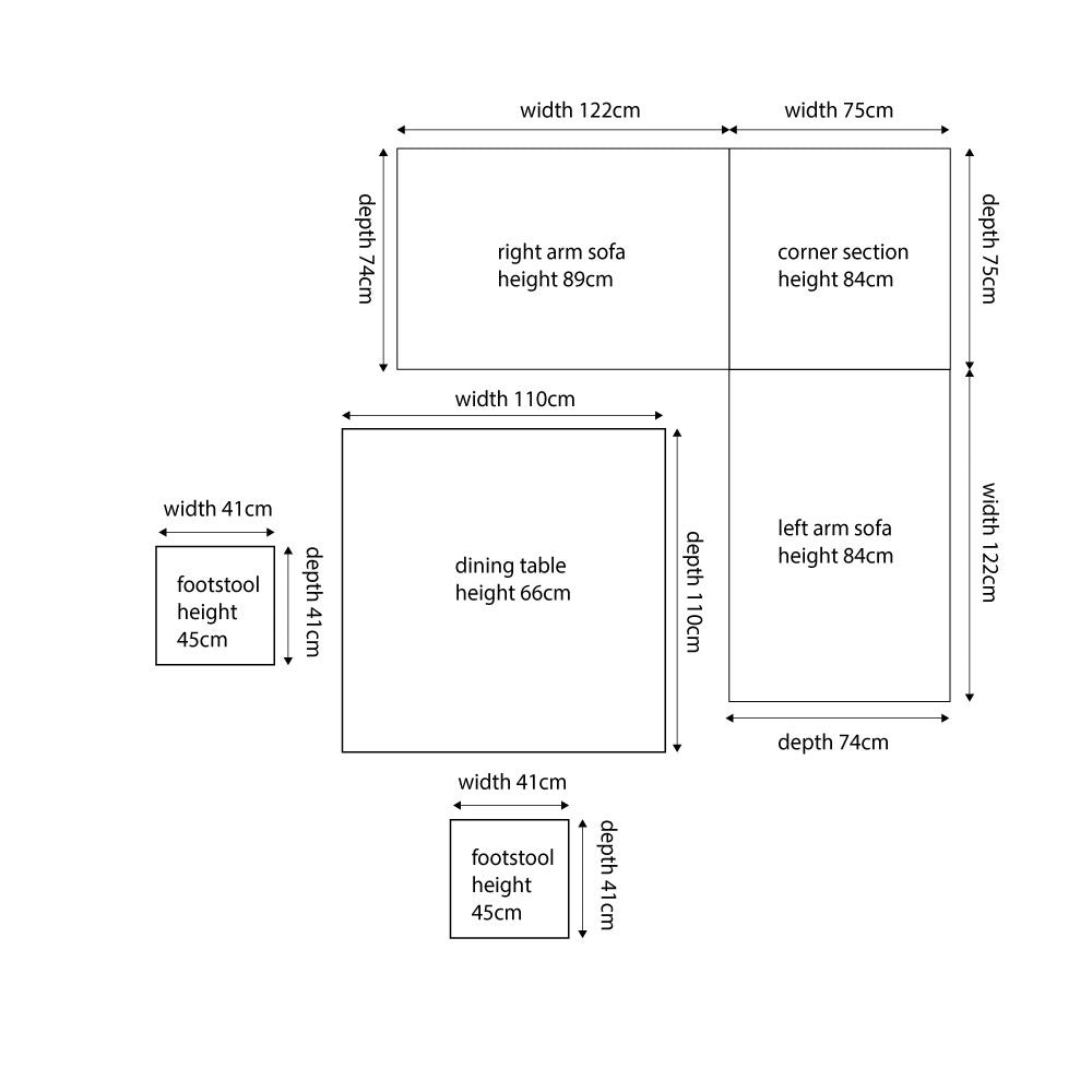 Set Area - W250 x D250cm Approx., Table - W110 x D100 x H66cm, Sofa - W197 x D197 x H54cm, Footstool - W41 x D41 x H45cm